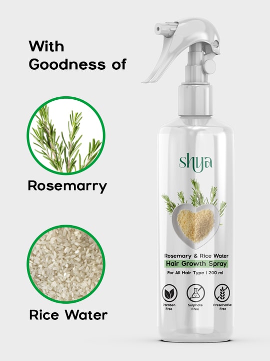 Introducing Shya Haircare's Rosemary and Rice Water Hair Growth Spray – a potent blend crafted to promote hair growth, enhance thickness, and minimize hair fall. This lightweight, non-greasy, and fast-absorbing formula is perfect for daily use, nourishing and protecting your hair while keeping it smooth and frizz-free. Enriched with 100% natural rosemary extract, it works as an effective leave-in conditioner post-wash and doubles as an overnight scalp treatment, ensuring a healthy scalp without the risk of fungal infections. Achieve stronger, healthier hair with Shya Haircare's Rosemary and Rice Water Hair Growth Spray!